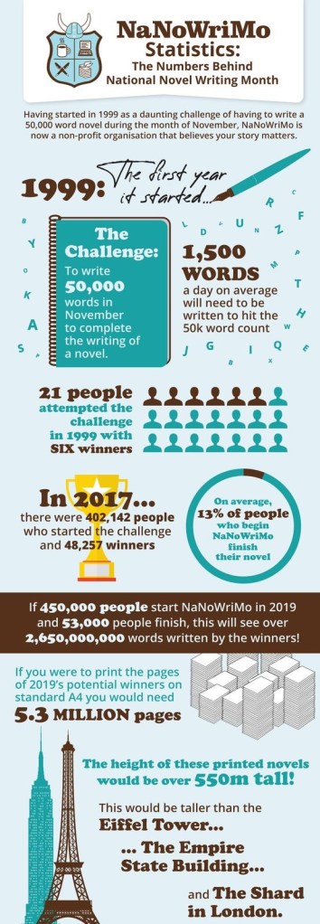 National Novel Writing Month began in 1999 as a daunting but straightforward challenge: to write 50,000 words of a novel in thirty days. Now, each year on the 1st of November, hundreds of thousands of people around the world begin to write, determined to end the month with 50,000 words of a brand-new novel. As far as I can see its open to everyone and free to take part. It’s for anyone thinking about writing a novel. To take part all you need to do is commit to writing 50,000 words of your novel in the 30 days of November. Which means writing 1,667 words per day. Which doesn’t sound that bad as a daily total.
